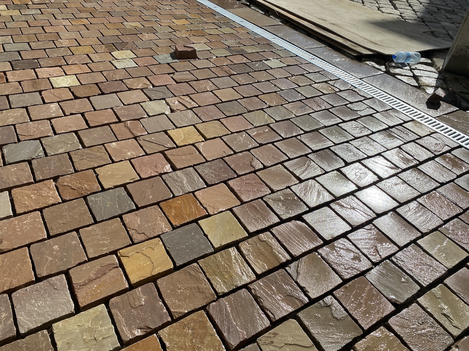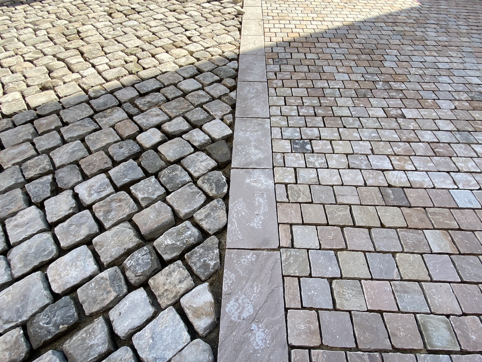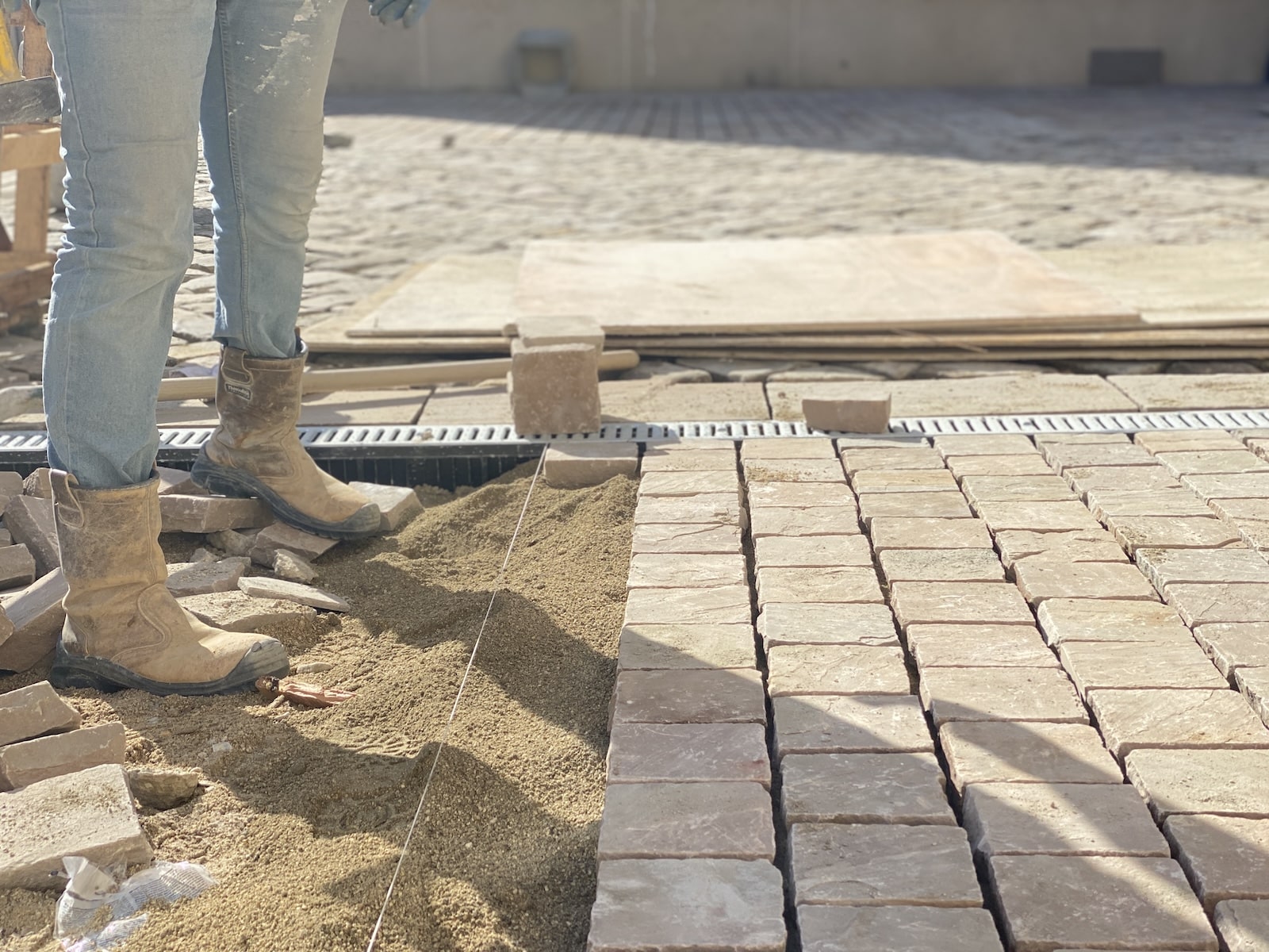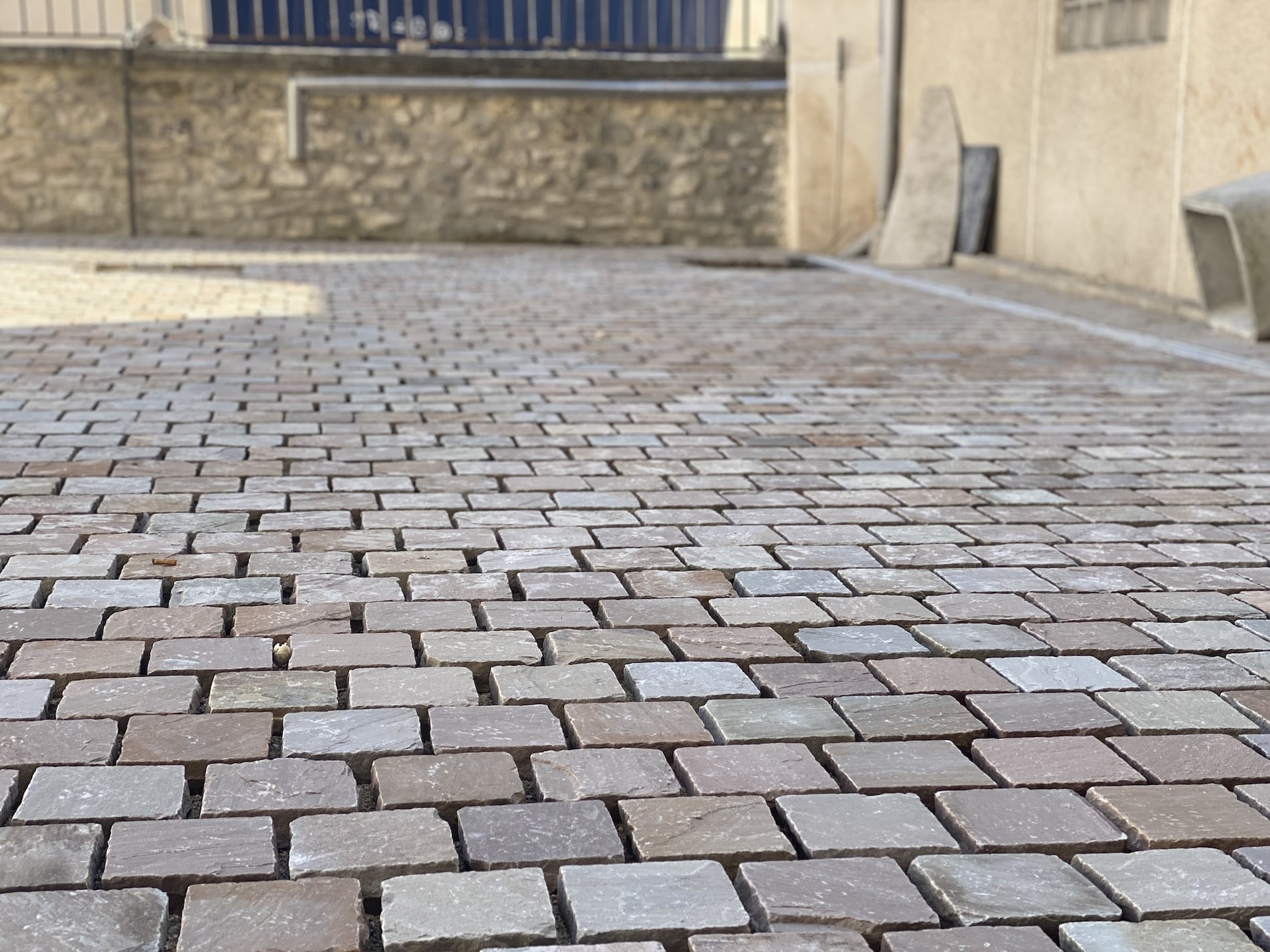 Le projet a porté une attention particulière à la conservation des éléments d’origine : une partie des pavés datant de l’époque napoléonienne a été soigneusement récupérée puis réemployée dans la cour, contribuant à préserver l’identité patrimoniale du lieu. En complément, des dalles et pavés en grès, à finition rectifiée, ont été posés afin d’assurer un bon écoulement des eaux, d’améliorer la durabilité des aménagements et de faciliter l’accès aux différentes zones du bâtiment.