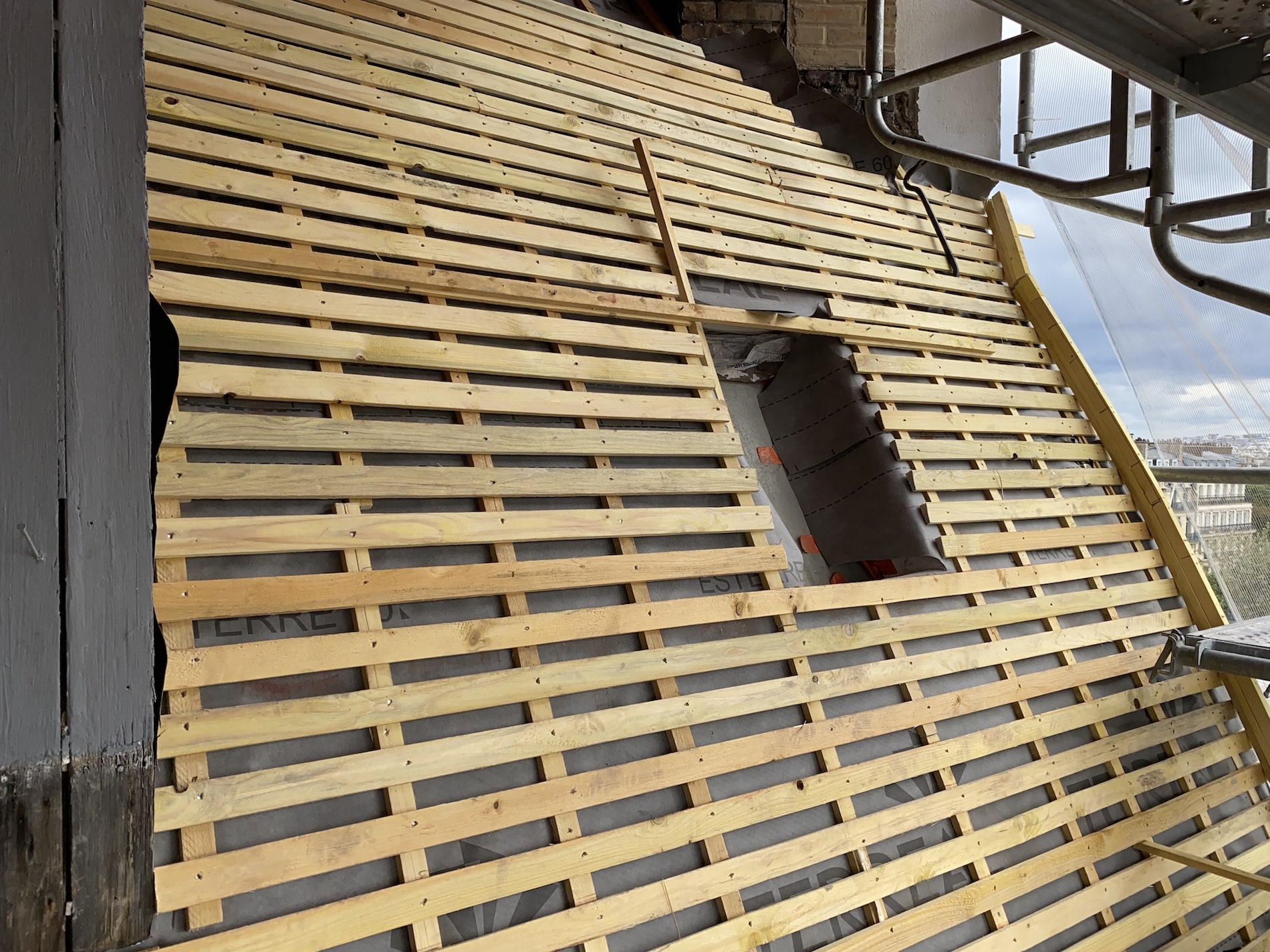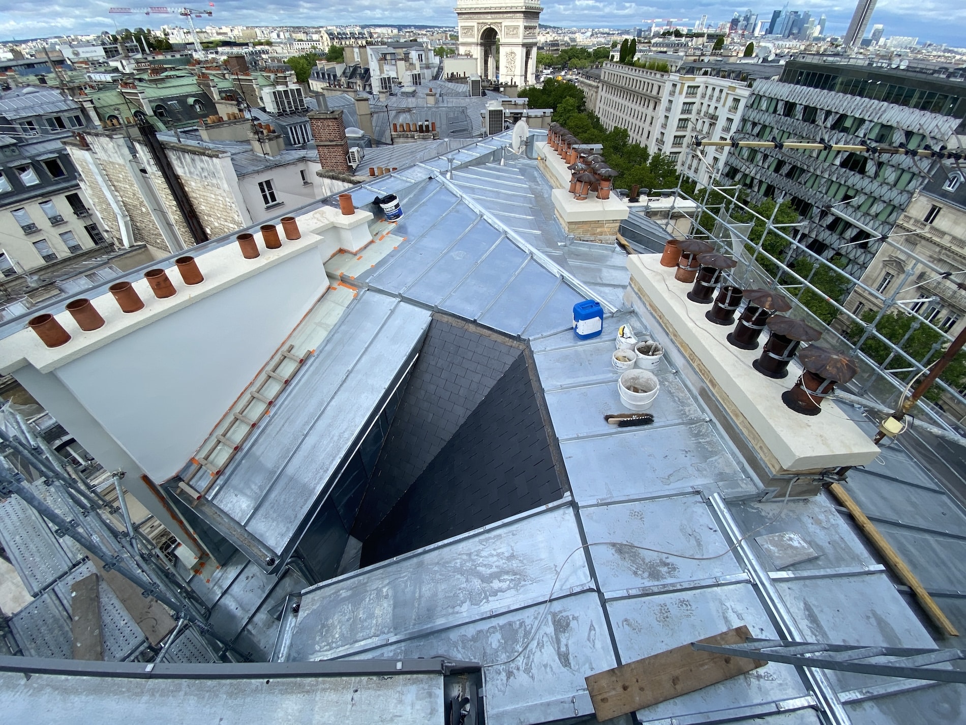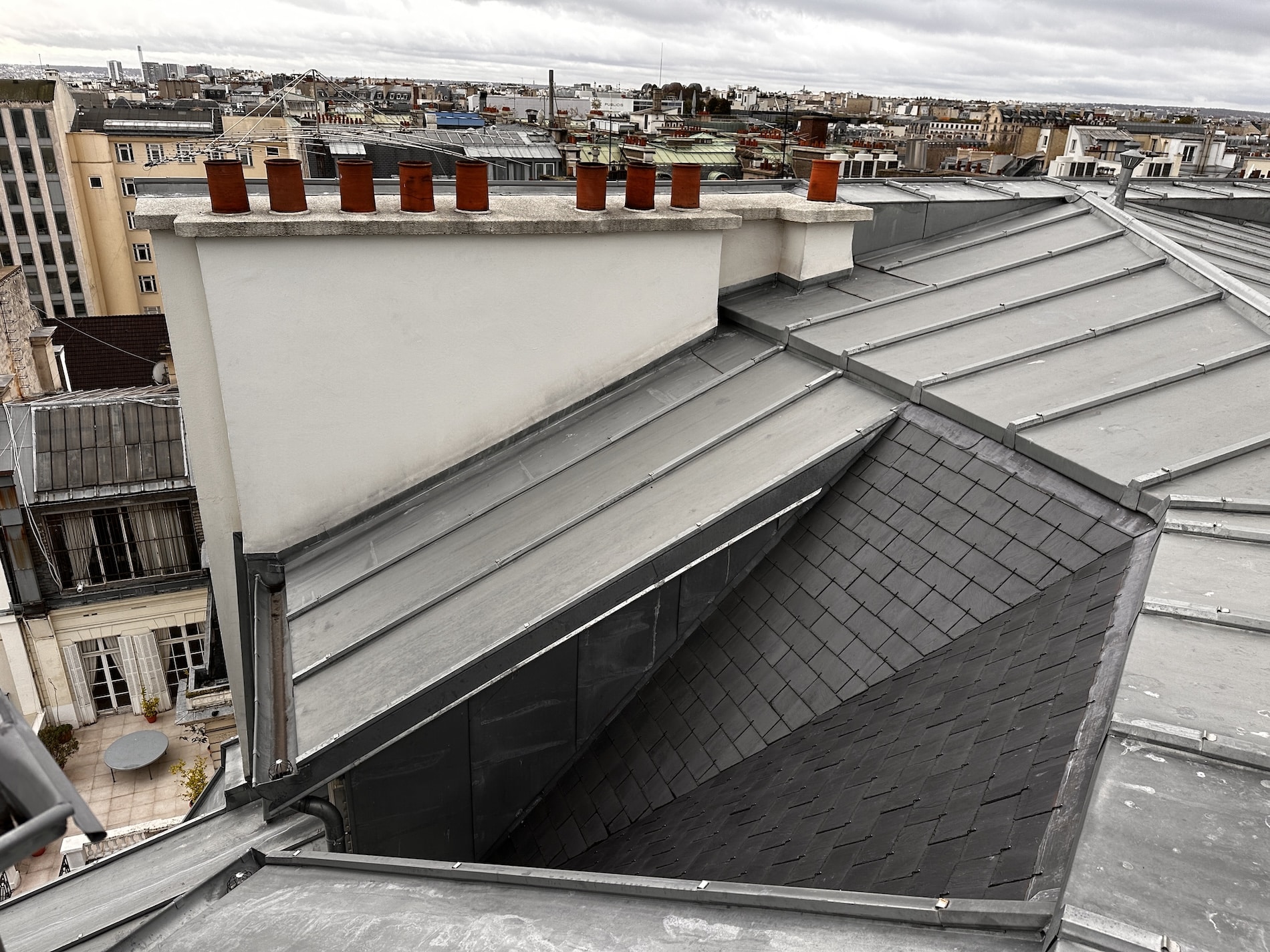 La couverture a été entièrement refaite avec la pose d’un zinc naturel sur l’ensemble des terrassons et la mise en œuvre d’ardoises sur les brisis, dans le respect de l’architecture existante. Une ventilation complète de la toiture a également été réalisée afin d’assurer le bon fonctionnement de la couverture et la conservation des matériaux dans le temps.